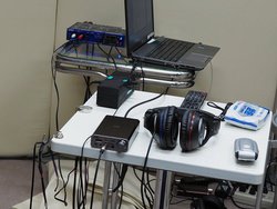 Exofieldは、個人の耳や顔の形状、基準となる再生スピーカーやリスニングルームなどを測定し、ヘッドホンでの音楽再生時に反映させることで、ヘッドホンを着けているのにスピーカーで音楽を聴いているかのような頭外定位を味わえるというもの。ブースでは実際に音響特性の測定を行うことができ、測定を反映した結果をポータブルアンプ「SU-AX01」とヘッドホン「HA-MX100」の組み合わせで試聴することがdできた。なお、測定の体験・試聴には整理券が必要で、配布はブース前で行っている。