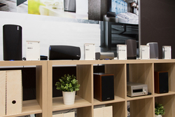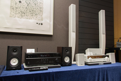 「リビングシアタールーム」では、ハイグレードシアターの反対軸となるお手軽・省スペースに臨場感が味わえるリビングシアター対応製品をアピール。上記5ブランドから、高品位なサウンドに合わせて設置性や扱いやすさも兼ね備えたホームシアターシステムや小型AVアンプが出展された。