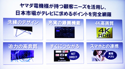 今回発売する製品は、ヤマダ電機の販売現場から得られる顧客のニーズを活用し、国内市場でテレビに求められるポイントを考慮し新設計。北米モデルは価格が優先されるが、今回の製品については画質/音質なども国内大手メーカーと同等基準以上に追求したとのこと。また、OEM事業で培った技術を投入し録画など機能面を充実させている。