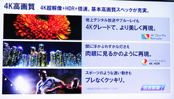 HDR規格はHDR 10に対応。4K関連では、動画配信サービス「Netflix」や「アクトビラ4K」に対応するほか、「ひかりTV 4K」へも2017年秋のアップデートで対応する予定。HLGへの対応も検討しているが、ドルビービジョンへの対応は現在のところ予定していないという。また、地上デジタル放送やブルーレイを4K画質にアップサンプリングする「4K Clear Pix Remaster機能」を搭載している。