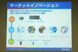 さらに同社が開発を進める印刷方式が、小型から大型までパネルのサイズを問わず活用できる技術であるとし、「大型パネル市場へは過去の蓄積技術も活かした新事業モデルでのアライアンス戦略を検討している。またスマートフォンやタブレットなど小型パネル市場への展開も視野に入れてさらなる高精細化技術の開発を進めたい」と述べた。