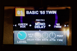 当日はGT200を使用。本モデルにはフットスイッチが付属しており、ルーパー機能を使ってフレーズを重ねて録音する事も可能とのこと。なお、フットスイッチは7月以降に別売(8,900円前後を想定)も予定しており、他のモデルでも使用できる。