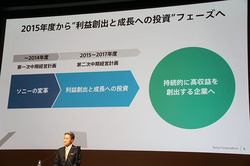 2015年2月に発表された中期経営計画では、それまでの構造改革を中心とした経営から、「利益創出と成長への投資」をテーマとする新たなフェーズへ移行すると宣言。また「ソニーグループ連結でROE10%以上、営業利益5,000億円以上」という数値目標も掲げていた。