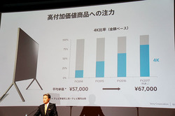 液晶パネル生産会社への出資を解消してパネルを外部調達に切り替える一方、他社との違いを生むため、画質と音質に徹底的にこだわるという姿勢を堅持。その結果テレビの平均単価が上がり、2014年度の57,000円から、今年度は67,000円まで上昇する見通しだという。同時に昨年度は営業利益率5%まで改善し、しっかり“儲かる事業”に変わった。