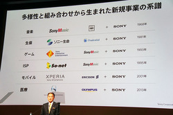 また平井氏は説明会の中で、多種多様な事業の複合体であるソニーを「一言で言えばKANDO(感動)会社」と説明。「KANDOを届けるのが一番の上位概念としてある」とし、それをコンシューマーエレクトロニクスやデバイス、金融などで実現するのがソニーであると定義づけた。