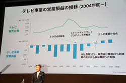 平井氏は社長就任前、副社長の時代に、当時最大の経営課題であったテレビ事業を担当することになった。社長就任後も赤字は止まらず、2004年度から累積で8,000億円以上の赤字を出し続けていた。そして2014年度、経営上の大きな判断を行う。「それまでの量を追う姿勢を改め、事業規模は半分以下でも収益を均衡させるという方針に改めた」(平井氏)。