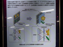 裸眼3Dでは、レンズアレーを用いたインテグラル立体ディスプレイの進化をデモ。4Kディスプレイ4枚を貼り合わせてそれぞれの映像を合成することで、立体映像の多画素化を実現する並列型インテグラル立体ディスプレイを展示している。