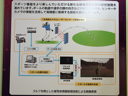 また、これと似たようなCG合成をもっと手軽に行える「実空間センシングによるスポーツ中継向け新映像表現技術」もデモ。こちらでは計測用カメラとレーザーセンサーでボールの軌跡や被写体情報を取得する。上記の「三次元被写体追跡スポーツグラフィックスシステム」よりも取得する情報が少ないが機動力が高く、例えばゴルフのセカンドショットなどでも撮影できるという。