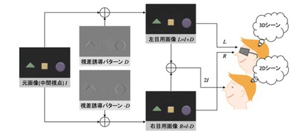しかし今回発表された技術では、人間が奥行きを知覚する際に働く視覚メカニズムの科学的知見を応用。両眼の中間地点から見たときの2D画像に対し、人間に奥行き情報を与える働きをする視差誘導パターンを加算/減算することで左目用/右目用画像を生成する。