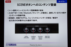 また、SCENE選択メニューにコンテンツ登録機能が追加された。これにより「NET」「USB」「Bluetooth」「チューナー」の場合において、選択しているラジオ局やコンテンツが登録可能となった。また、従来通り音場プログラムやミュージックエンハンサーの有効/無効、出力先のHDMI端子なども選択できる。