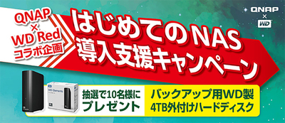 テックウインド(株)は、同社が取り扱うQNAPとのコラボレーション企画として、QNAPのNAS製品 2ベイモデルの購入者を対象とした「はじめてのNAS導入支援キャンペーン」を実施。抽選で10名にWD製外付けHDD(4TB)をプレゼントする。応募期間は6月26日から8月31日まで。