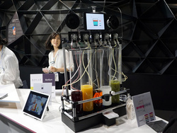 そのほか乃村工藝社は、“音楽を味覚化”を可能にする「Squeeze Music」という一風変わったコンセプトのデバイスを展示。音楽の波形から判断し、楽しい曲調のときには甘いジュース、センチメンタルな曲調のパートではしょっぱいジュースといった具合にドリンクをミックスしていくというもので、曲の展開にあわせてさまざまな味のドリンクがミックスされている。