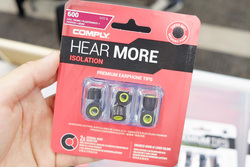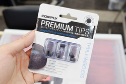 コンプライのブースでは、従来のイヤーピースにくわえ、200、400、500といったノズルサイズの大きなモデルに使用できる「SmartCore」シリーズと、ワイヤレスイヤホン向けのイヤホンチップを展示。