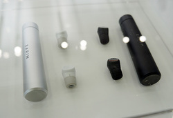 モダニティでは、EARINの完全ワイヤレスイヤホン「M-2」が今回の目玉になる予定だったが、残念ながら試聴機の到着が間に合わず。ガラスケースに入った状態で、デザインを確認できる状態になっていた。