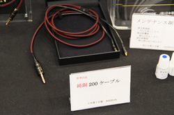 日本電子音響(NIDEON)は、同社リケーブル製品を一斉に展示。フラグシップの「200シリーズ」に純銅のプラグを採用した新モデルや、それに合わせて銅の酸化防止/除去などメンテナンス用の薬剤など新製品も出展している。純銅プラグ仕様の200シリーズはオーダー受付を開始しており、通常の200シリーズの価格に約5,000円プラスになるとのこと。メンテナンス剤は7月末頃からの発売を予定、価格は1,000円〜1,500円前後とのこと。