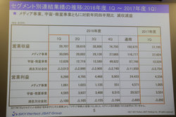 セグメント別の第1四半期の連結業績については、メディア事業の営業収益が前年同期から26億7100万円減の274億2,400万円、宇宙・衛星事業の営業収益が前年同期から1億200万円減の125億2,400万円となった。