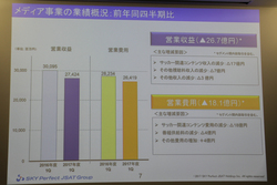 各事業の詳細についても紹介。メディア事業の営業収益減の要因は、「サッカー関連コンテンツ収入の減少」で17億円減、「その他視聴料収入の減少」で7億円減、「その他収入の減少」で3億円減とのこと。宇宙衛星事業の営業収益減の要因としては、「放送トランスポンダ収入の減少」における2億円減、「その他収入の増加」での1億円増が挙げられた。