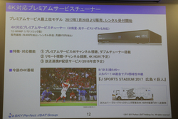 4K専門チャンネルによる4K放送にも注力して、大画面・高精細というクオリティ面でも差別化を図っていく。7月20日からは、スカパー!プレミアムサービスの4K対応チューナーとしては初のダブルチューナー搭載機器「TZ-WR4KP」を発売(関連ニュース)。今後の注目4K番組として、プロ野球中継として初の4K/HDR放送となる「J SPORTS STUDIAM 2017 広島×巨人」も挙げられた。