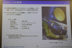 2019年度下期には、直系18mの大型アンテナを搭載する新たな衛星「JCSAT-17」を打ち上げ予定。この衛星は移動体通信用Sバンド、およびCバンドを搭載。関係当事者の合意がない限り破棄または終了ができない長期安定的な使用権「IRU契約」のもと、NTTドコモが本衛星を使用する。軌道位置は東経136度となる。