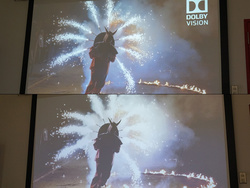 ドルビービジョンの魅力については、ドルビージャパンの社屋で上映デモも実施。『BLAME!』をドルビービジョンのHDRとSDRで比較上映し、その違いを見せるデモが行われ、「全体を通してシャープネスが上がり、何も知らずに見た人からは(同じ2K映像なのに)2Kと4Kの比較なのかと勘違いされることもある」(ドルビージャパン 映像技術ディレクター 真野克己氏)などとアピールした。