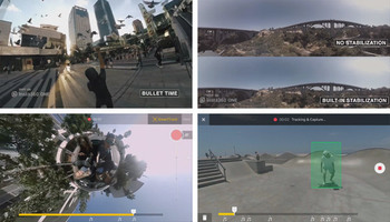 初の機能として、カメラ本体に自撮り棒や紐を取り付け撮影者の周囲を巡らせることで、撮影者を中心として周囲の360度映像を撮影する「バレットタイム撮影」を搭載。自撮り棒や紐は映像処理によって自動で消すことが可能。