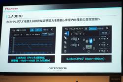 その他、車種ごとに異なる社内環境に適応するため、チャンネル間独立の31バンドイコライザー、0.35cmステップで変更可能な音場調整機能「タイムアライメント」など、多彩な音響調整機能も搭載し、「超臨場」を追求している。