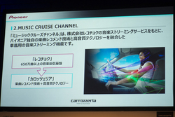 新「サイバーナビ」もう1つの特徴として、乗車中から降車後まで楽しめる、音楽ストリーミングサービス「ミュージッククルーズチャンネル」が挙げられた。(株)レコチョクが本日から提供を開始した月額300円(税抜)の音楽ストリーミングサービス「レコチョク Best ライトプラン」を利用した機能となる。