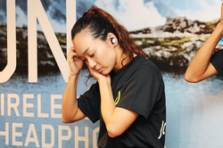 装着性については、ケーブルレスの完全ワイヤレスとしたことでより軽量化を図りつつ、豊富なアクセサリー類で個々人にあった快適なフィット感を実現するという。装着感の高さは遮音性も高さにもつながり、皇居ランなど外での使用について周囲の音が聞こえづらくなるのでは?という質問も挙がったが、「RUNは右側が親機、左側が子機になっており、左側のみOFFにして使うことも可能。狭いところや人の多いところでは右側のみを使用することで周囲の音も確認しながら使ってもらえたら」と回答した。