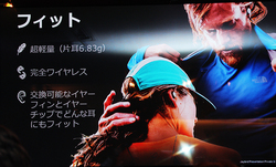 【SPEC】●インピーダンス:16Ω ●Bluetoothバージョン: 4.1 ●周波数帯域: 2.4 GHz ●プロファイル:ハンズフリー、ヘッドセット、A2DP、AVCRP、SPP ●コーデック:SBC ●再生時間:4時間以上 ●充電時間:2時間(クイックチャージ:5分で1時間の再生時間) ●外形寸法:14.3D×19.5H×19Dmm ●質量:6.83g(フィンとチップなし、片側のみ)