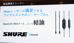 Shureの製品開発においては「いつもユーザーの声を聞いて開発をしている」とし、「Bluetooth製品へのユーザーからの期待は無視できない。Shureユーザーが満足できるワイヤレスイヤホン、SEシリーズイヤホンに最適化して性能を最大限引き出すケーブルを、Shure自身が開発すべきだという結論に至った」と語った。
