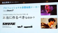 この点について、「Shureはプロフェッショナル音響機器メーカー。これまでプロがライブなどのステージで使っても支障ない高いレベルのモノづくりをしてきた」とし、そういった中でワイヤレス製品に関しては「ワイヤレス=Bluetoothを扱う以上はレイテンシー(遅延)は避けられず、プロがイヤモニとして使う製品になるかといったら、使わないだろう。そういった観点からShureでは、ワイヤレスモデルを一般コンシューマー向けに特化した製品と捉えており、開発するには今までのShureの理念や設計思想から転換することになるため、社内で様々な意見があった」と説明した。