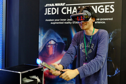 ARの取り組みでは、スマートフォンと接続して使用する「Lenovo Mirage ARヘッドセット」、ヘッドセットとBluetoothでペアリングすることでコントローラー兼ポインターとなる「ライトセーバー・コントローラー」、プレーヤーの動きを検出する「トラッキング・ビーコン」がセットとなった「Star Wars/ジェダイ・チャレンジ」を展示。こちらは10月中旬より予約開始で、価格は30,800円(税抜)。商品出荷は11月中旬が予定されている。