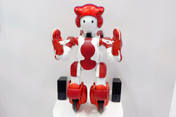 また、2018年度中のサービスインを目指しているという支援ロボット「EMIEW3(エミュー3)」も展示。実際に羽田空港や東京駅などで実証実験が進められているという。スタンドアローンだった「EMIEW2」に対して、こちらはクラウド上のロボットIT基盤で知能処理を行う点に大きな変更があり、複数ロボットのデータ共有やシームレスな連携が行えるという。導入は受付案内などが想定され、用途によってプログラムを行っていくとしている。