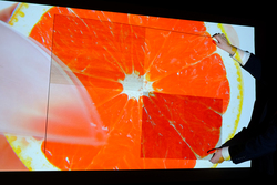 リビングにプロジェクターを導入する場合、スクリーンの設置がハードルになることも考えられる。そこで、壁に直接、映像を投写したブースも用意。白壁だけでなく、さまざまなパターンの壁でもキレイな映像を楽しめることがデモされた。