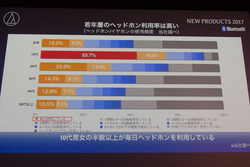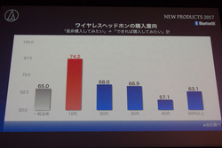 また同社が今年、ヘッドホン/イヤホンの使用頻度について独自に調査を実施したことも紹介。この調査において10代の53.7%がヘッドホン/イヤホンを「毎日に使用している」と回答。さらに10代の74.2%がワイヤレスヘッドホンを「ぜひ購入してみたい」または「できれば購入してみたい」と回答したという。これを踏まえて、今後のBluetoothヘッドホン市場を支えていくのは10代・20代であるとして、同社としてもこの層にアピールできるラインナップや活動に力を入れていく。
