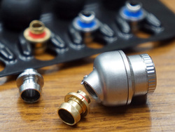 上位機SOLIDEGE 01 innerは、ノズル部を交換できる「Jマウントノズル交換システム」を採用。チタン、ステンレス、真鍮という3種類のノズルを同梱し、ノズル交換によって各金属の音色の違いを楽しめるようにしている。