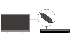 テレビとの接続は、付属のスライドボリューム付音声ケーブル(専用ケーブル)をテレビのヘッドホン端子(音声出力端子)とつなぐことで完了。ヘッドホン端子からの音声を検出し、サブウーファーの電源がテレビの電源に連動する。
