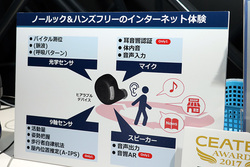 もう一つ、NECが行っていた注目展示は、ヒアラブルデバイス向けのWeb APIを提供するという新たなサービスだ。試作機には様々なセンサーを組み込んでおり、他社製品でも実現している脈拍や呼吸パターンの測定、音声UIへの利用、活動量の計測、ナビゲーションなどは本試作機でも行える。