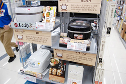 客数が最も多いとされる同百貨店の2階と3階に売り場を構え、入口となる2階は女性を意識したフロア構成とした。ビューティグッズやフィットネス商品、薬や日用雑貨を配置。最新美容家電などの試せる展示を豊富に用意し、「足を止めていただける売り場レイアウトに工夫を凝らした」(和歌山大店長)と訴える。調理家電では、レシピブックやキッチン雑貨と組み合わされ、毎日の料理を楽しく便利にする演出が随所に溢れる。