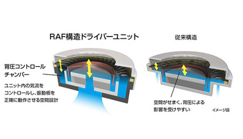 ドライバーはφ11mmのダイナミック型で、RAF構造を採用。RAFとは「Rear Air Flow System」の略で、ダイナミックドライバーユニットの後方に、背圧を正確にコントロールするチャンバーを設けた。これにより振動板の制動性能を高め、レスポンスと過渡特性の向上を図ったという。