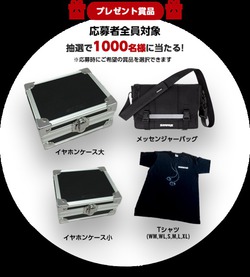 用意されるプレゼントは「イヤホンケース小」「イヤホンケース大」「メッセンジャーバッグ」「Tシャツ(WM/WL/S/M/L)」。応募時に希望の品を選択することができるようになっている。