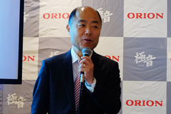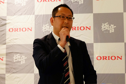 イベントでは冒頭、オリオン電機の常務執行役員 鹿取泰郎氏が「オーディオのパーツや技術を多様した、音に特徴があるテレビ。テレビは薄型化、大型化、高画質に投資され音が良くないと言われ続けており、一方でコンテンツのクオリティは映像と共に音も向上してきた。そこに注目して、良い音でテレビを見ていただこうと設計した」と極音について説明。