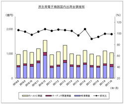 国内出荷の内訳は、映像機器が462億円(前年比97.3%)、オーディオ関連機器が、104億円(前年比106.2%)、カーAVC機器は469億円(前年比98.5%)となった。