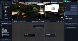 コンテンツの開発はウェブベースのエディターで行う。家具、建物、自然オブジェクトなどの3Dオブジェクトや文字を、部屋、オフィス環境、風景など様々なものがあらかじめ用意された「シーン」にドラッグアンドドロップして配置。アクションなどはビジュアルスクリプトで制御できる。