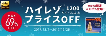 (株)レーベルゲートは、同社が運営する音楽配信サイト「mora」にて、約1,200タイトルのハイレゾ音源が最大69%オフになる「冬のハイレゾプライスOFFキャンペーン」を開始した。期間は、12月25日まで。