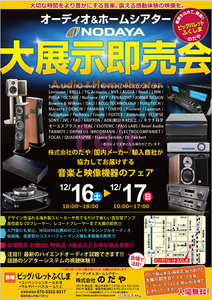 オーディオ・ホームシアター専門店「のだや」は、展示即売会を12月9日(土)・10日(日)に仙台「夢メッセみやぎ」で、12月16日(土)・17日(日)に郡山「ビッグパレットふくしま」でそれぞれ開催する。