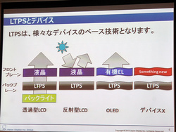 瀧本氏は、同社のコア技術であるLTPS(低温ポリシリコン)が液晶だけでなく有機ELなど様々なデバイスのベース技術であること、中小型液晶の市場において近年急激にシェアを伸ばしておりa-Si(アモルファスシリコン)に迫る勢いであることなどを紹介。同社のコア技術がディスプレイ業界にとって非常に重要なポジションであると説明する。