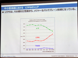 なお、LTPSはa-Siに対して移動度が100倍の性能を持っており、開口率の高さから消費電力や輝度、解像度の点で有利なこと、また応答速度も速いほか、ベゼルも狭くしやすいことなどがメリット。こういったことを背景にLTPSがシェアを上げているという。