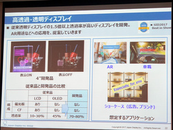 同ディスプレイは液晶でありながら偏光板もカラーフィルターも使用していない点が特徴。従来品では透過率が液晶で10〜30%、有機ELでも45%程度であるところを、今回の開発品では70〜80%へと高めることに成功している。今後はARや車載、店頭ショーケースなどでの応用を提案していくという。