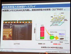そのほか、画素にメモリ(SRAM)を内蔵することで超低消費電力を実現した「超低消費電力反射型ディスプレイ」も紹介。32インチ/フルHDの開発に成功しており、バックライトを用いる一般的なディスプレイと比べて約200分の1という超低消費電力を実現していることなどを紹介し、「もう量産レベルにある。小さなサイズでは量産の実績を積み重ねている」と述べた。